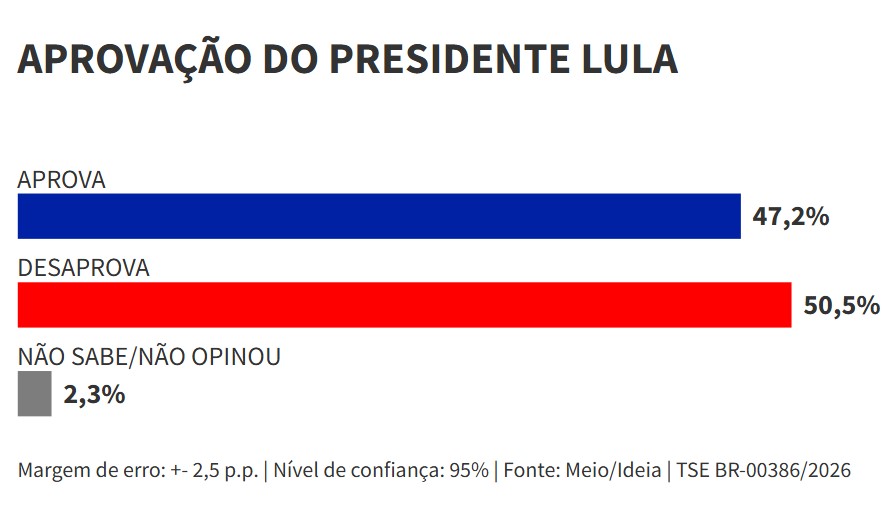 A pesquisa Meio/Ideia ouviu 1.500 eleitores entre os dias 6 e 10 de março, por meio de entrevistas representativas em todo o país. A margem de erro é de 2,5 pontos percentuais, para mais ou para menos, com nível de confiança de 95%. O levantamento foi registrado no Tribunal Superior Eleitoral sob o protocolo BR-00386/2026.