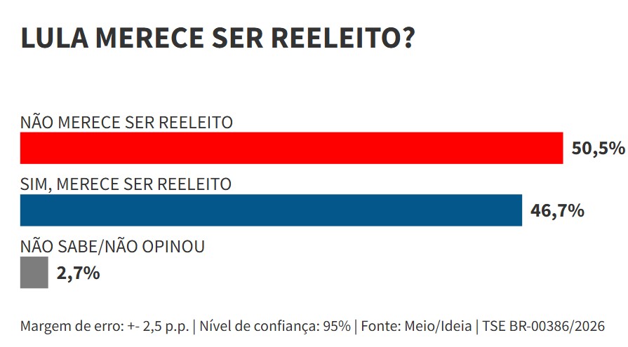 De acordo com a pesquisa, 50,6% da população acredita que Lula não merece continuar no cargo após o fim do atual mandato, enquanto 46,7% defendem sua permanência. Outros 2,7% não souberam opinar. Na prática, o resultado mostra que mais da metade dos brasileiros já rejeita a possibilidade de continuidade do atual governo, um cenário extremamente delicado para qualquer projeto de reeleição.