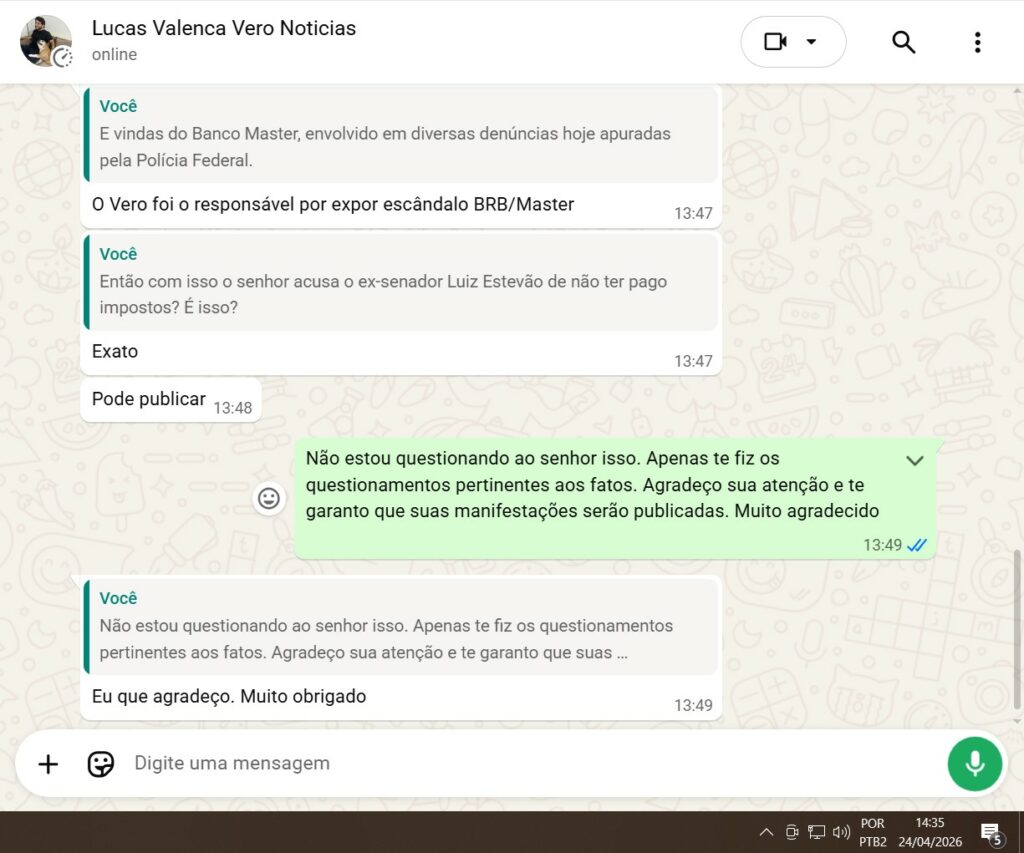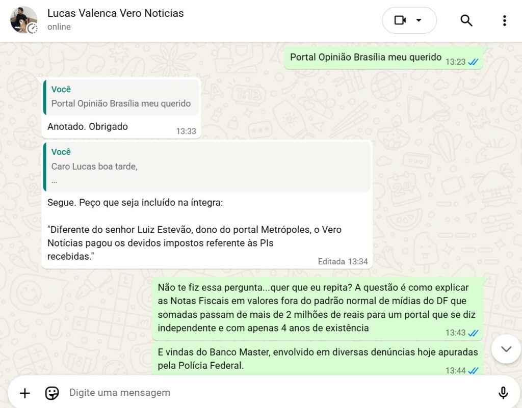 O editor do Vero Notícias, Lucas Costa Valença, reagiu ao ser questionado pelo Portal Opinião Brasília. “Diferente do senhor Luiz Estevão, dono do Metrópoles, o Vero Notícias pagou os devidos impostos”, afirmou, admitindo a transação, mas tentando blindar-se com o recolhimento tributário.