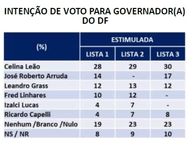O levantamento, realizado entre os dias 27 e 29 de outubro de 2025, ouviu 800 eleitores por telefone e tem margem de erro de 3,5 pontos percentuais, com nível de confiança de 95,5%. Os números mostram Celina com 28% das intenções de voto, o dobro do ex-governador Arruda, que amarga 14% — o mesmo índice do descrédito que carrega desde que foi condenado por corrupção e teve sua inelegibilidade confirmada pelo STJ. Veja abaixo: