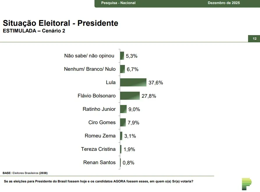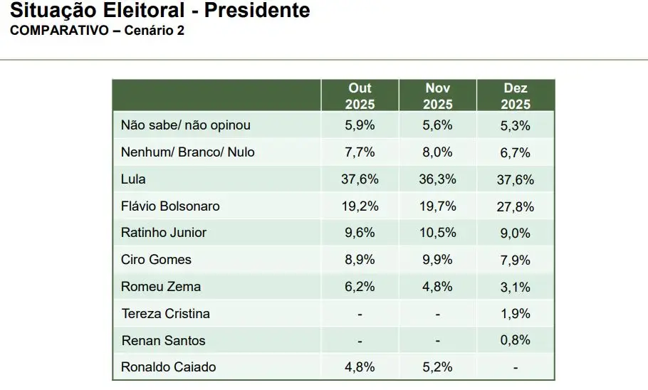 Anteriormente, Flávio aparecia nas sondagens com 19,2% das intenções de voto (outubro) e 19,7% (novembro), o que mostra que ele subiu oito pontos percentuais desde que passou a ser o nome do ex-presidente da disputa. A desvantagem para Lula, que era de quase dezessete pontos, caiu para menos de dez — veja quadro abaixo: