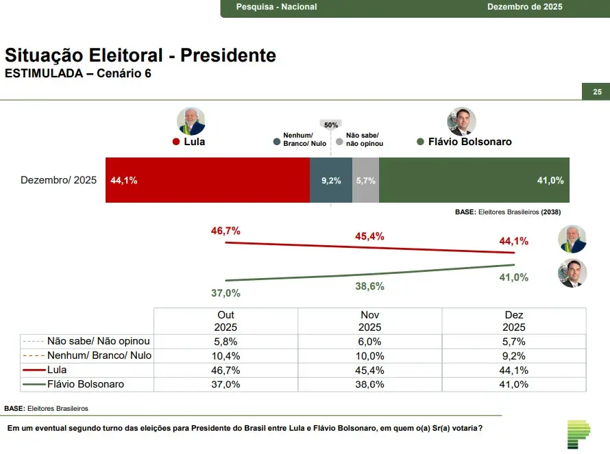 No segundo turno, a vantagem de Lula para Flávio também caiu desde outubro, quando a disputa estava em 46,7% para o presidente contra 37% do senador do PL. Hoje, o parlamentar estaria com 41% das intenções de voto, enquanto o petista somaria 44,1%, o que configura empate técnico dentro da margem de erro — veja abaixo a mudança de cenário: