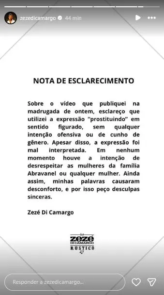 O cantor Zezé di Camargo divulgou uma nota oficial na tarde desta terça-feira (16) para se posicionar sobre a repercussão de um vídeo em que afirmou que as filhas de Silvio Santos estariam “se prostituindo”.