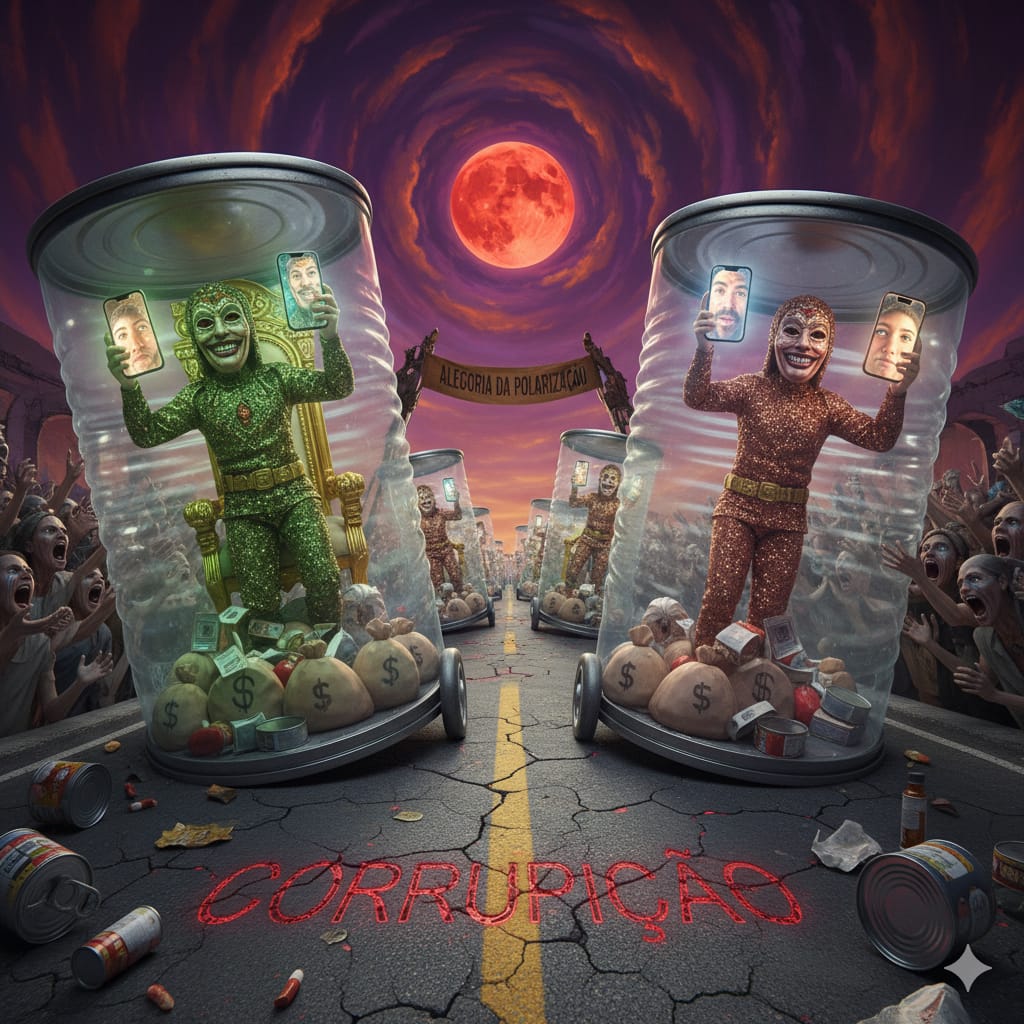 A alegoria mais honesta deste desfile é a das latas herméticas. Pessoas confinadas em suas próprias verdades, lacradas para o diálogo, desfilando o isolamento sob o disfarce da festa. É o triunfo da Caverna de Platão em plena Sapucaí: um país de cegos, surdos e mudos que confunde sombra com realidade.